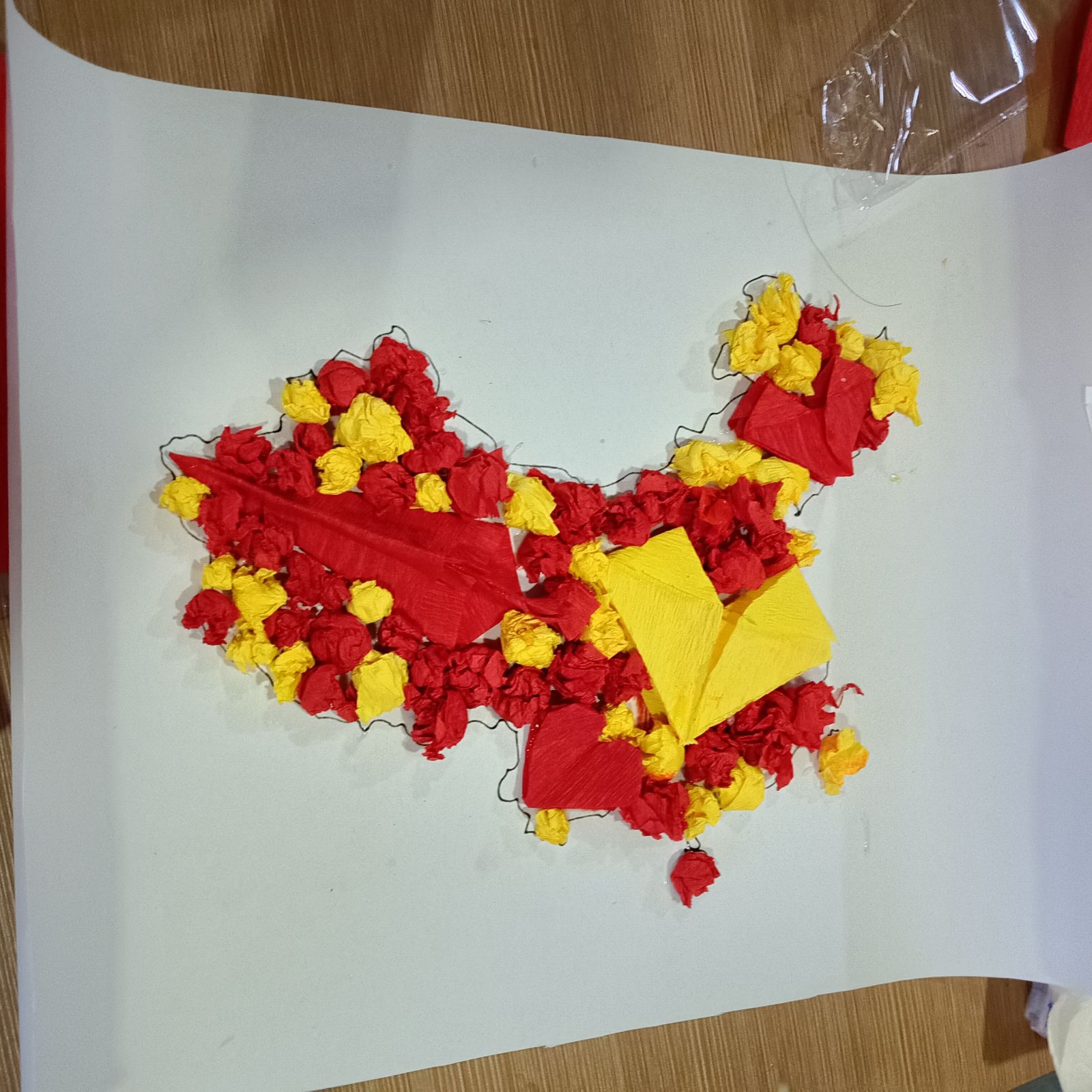 “共绘山河” 拼中国地图环节,工作人员精心备齐材料,参赛小组通力协作,有序完成:先将彩纸裁剪,折叠成花团,再沿图案轮廓铺贴,逐渐填满地图。一簇簇花团经协作汇成完整图景,中华大地地图跃然眼前。作品成果既是祖国疆域缩影,更凝聚青年学子同心守护家国、携手共赴未来的信念与担当。