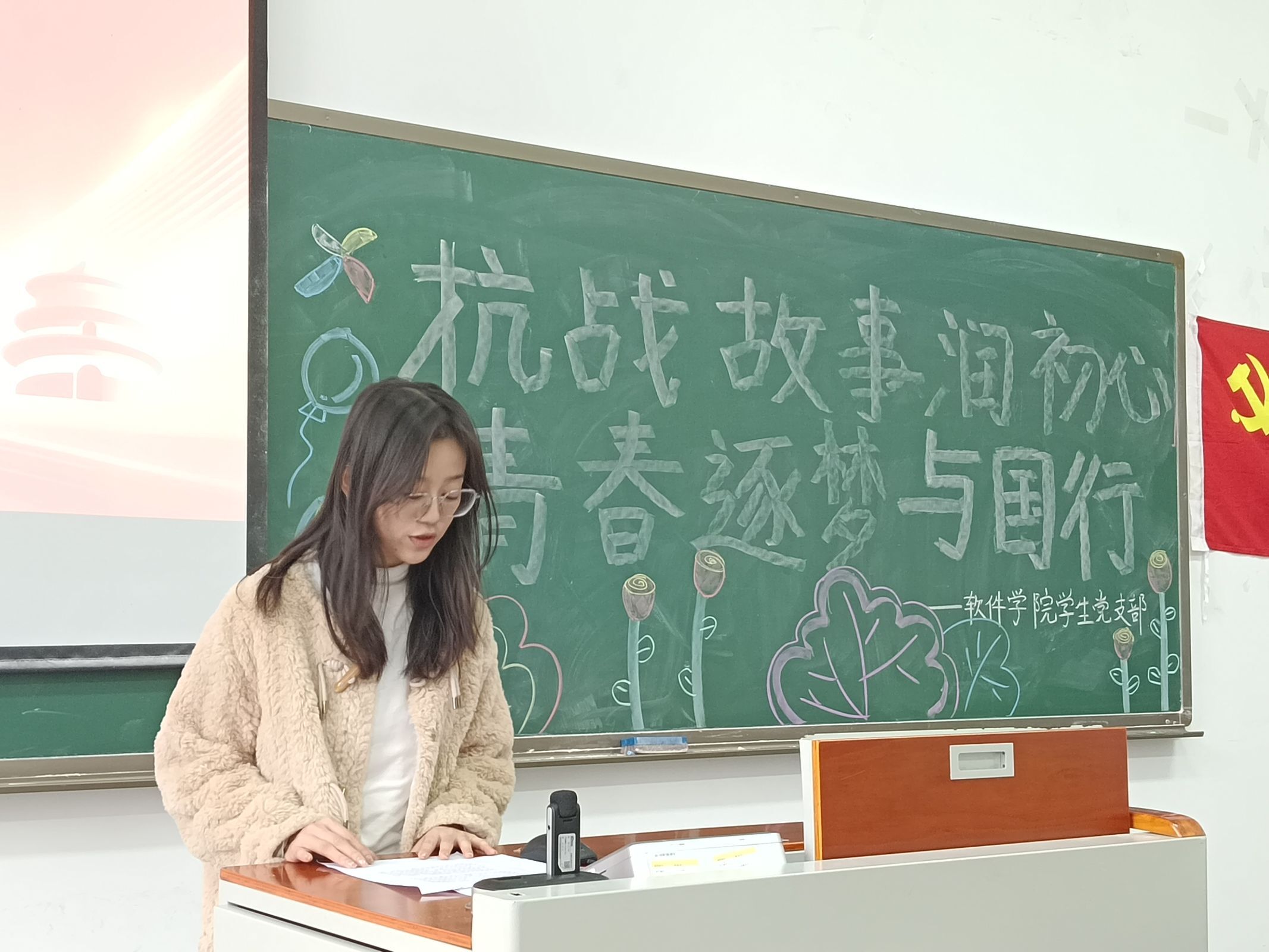 为铭记历史、缅怀先烈,弘扬伟大的抗战精神,软件学院学生党支部于11月14日中午12:30,在教室1407开展“抗战故事润初心·青春逐梦与国行”主题故事分享活动。活动由向菲同志带领大家共同聆听那段波澜壮阔的历史回响。