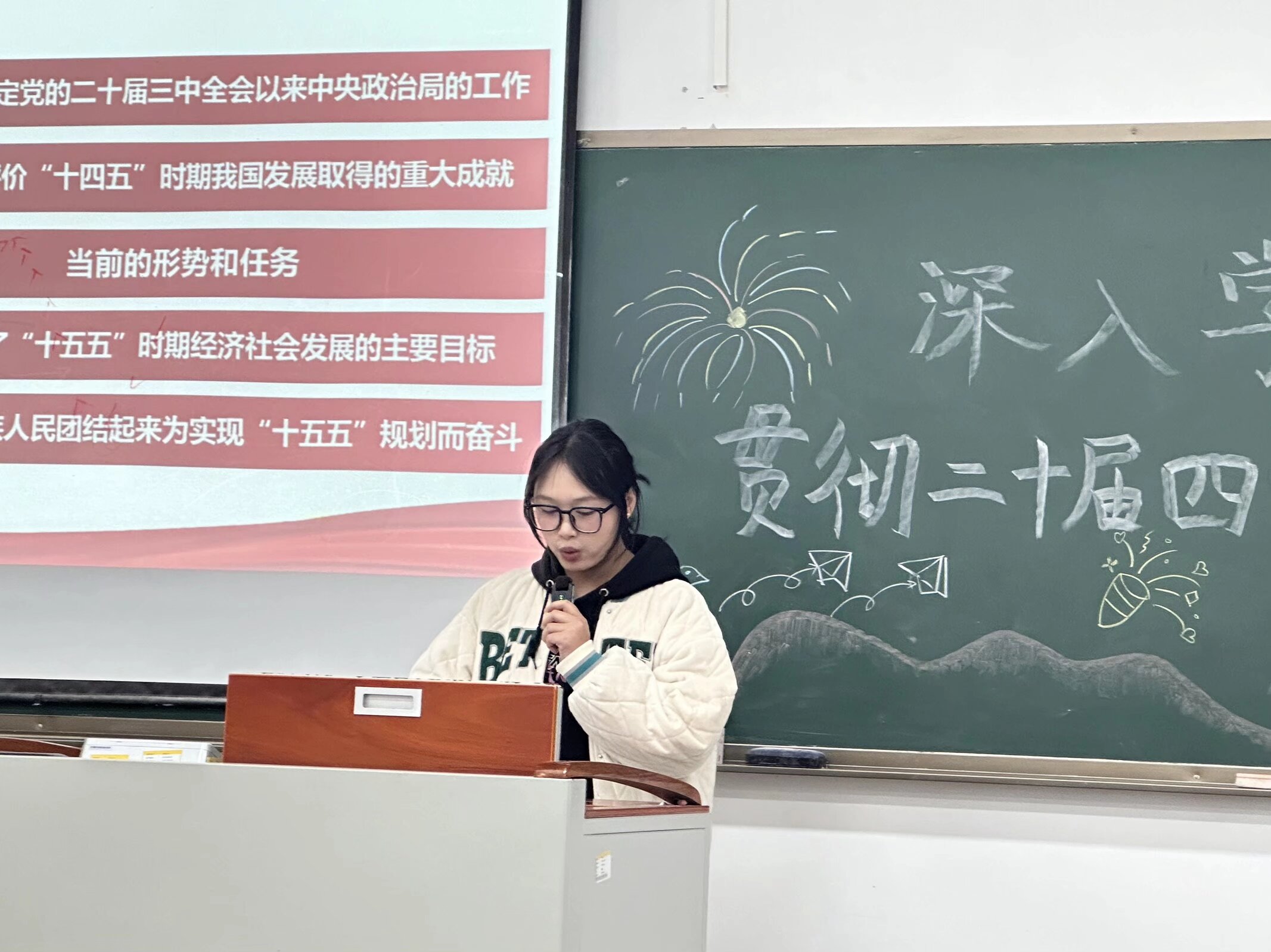 针对全会涵盖民生保障、科技创新等关键领域的部署,谭洋洋同志紧扣要点引导学生党员体悟精神的实践伟力。党课尾声以“十五五”关键词解读视频收尾,直观呈现实践导向与发展蓝图,让学生党员深切感受时代责任与机遇,坚定以所学融入大局、以实干回应召唤的信念。