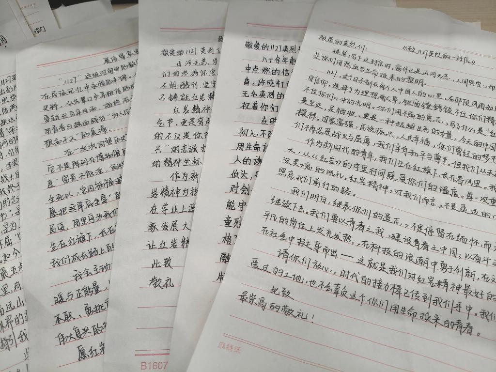 活动启幕前,参与者以笔为媒,精心书写《致1127英烈们的一封信》:有人落墨“你们把牢底坐穿的决绝,是我们啃下学业硬骨的底气”,有人抒怀“以青春之我,续你们未尽的山河壮阔”。这一纸书怀,是跨越时空的对话,让遥远英魂的风骨,成了青年心尖滚烫的回响。