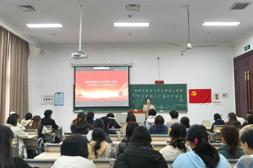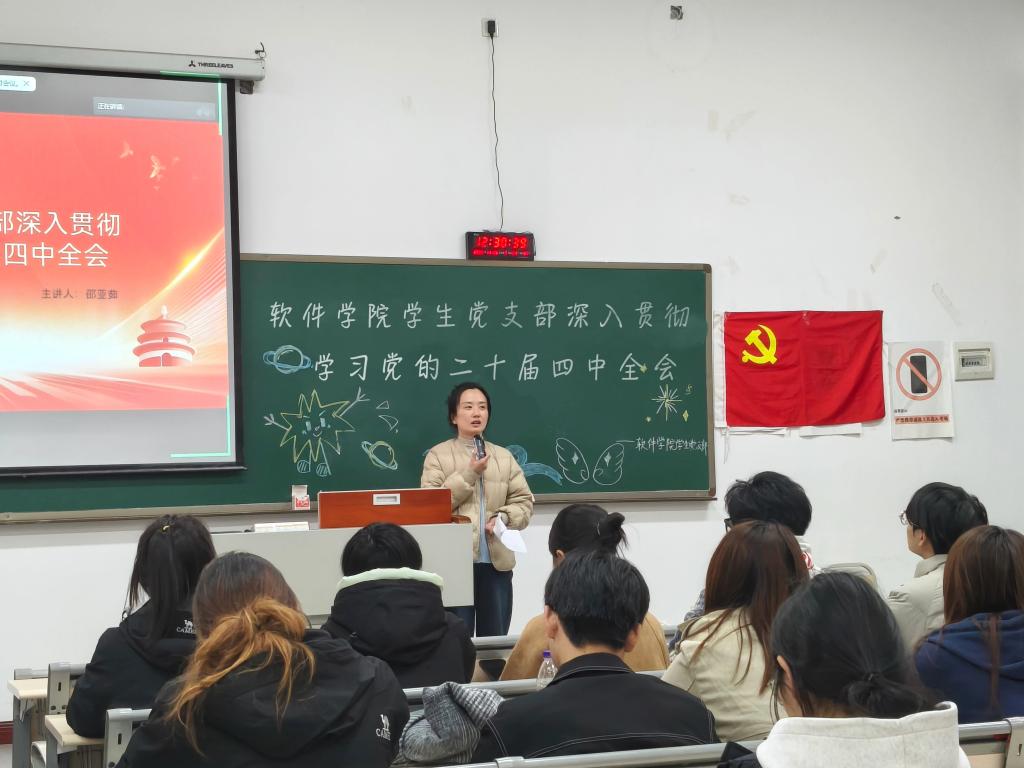 为学深悟透全会精神实质,激发青年党员实干兴邦的使命担当,11月26日中午12:30,软件学院学生党支部在教室1619召开二十届四中全会专题学习会。此次学习由学生党支部书记邵亚茹老师带领学生党员围绕全会“精神密码”开展集中研学。