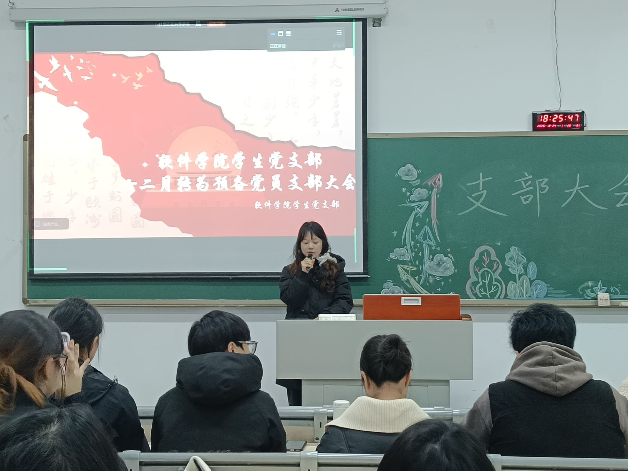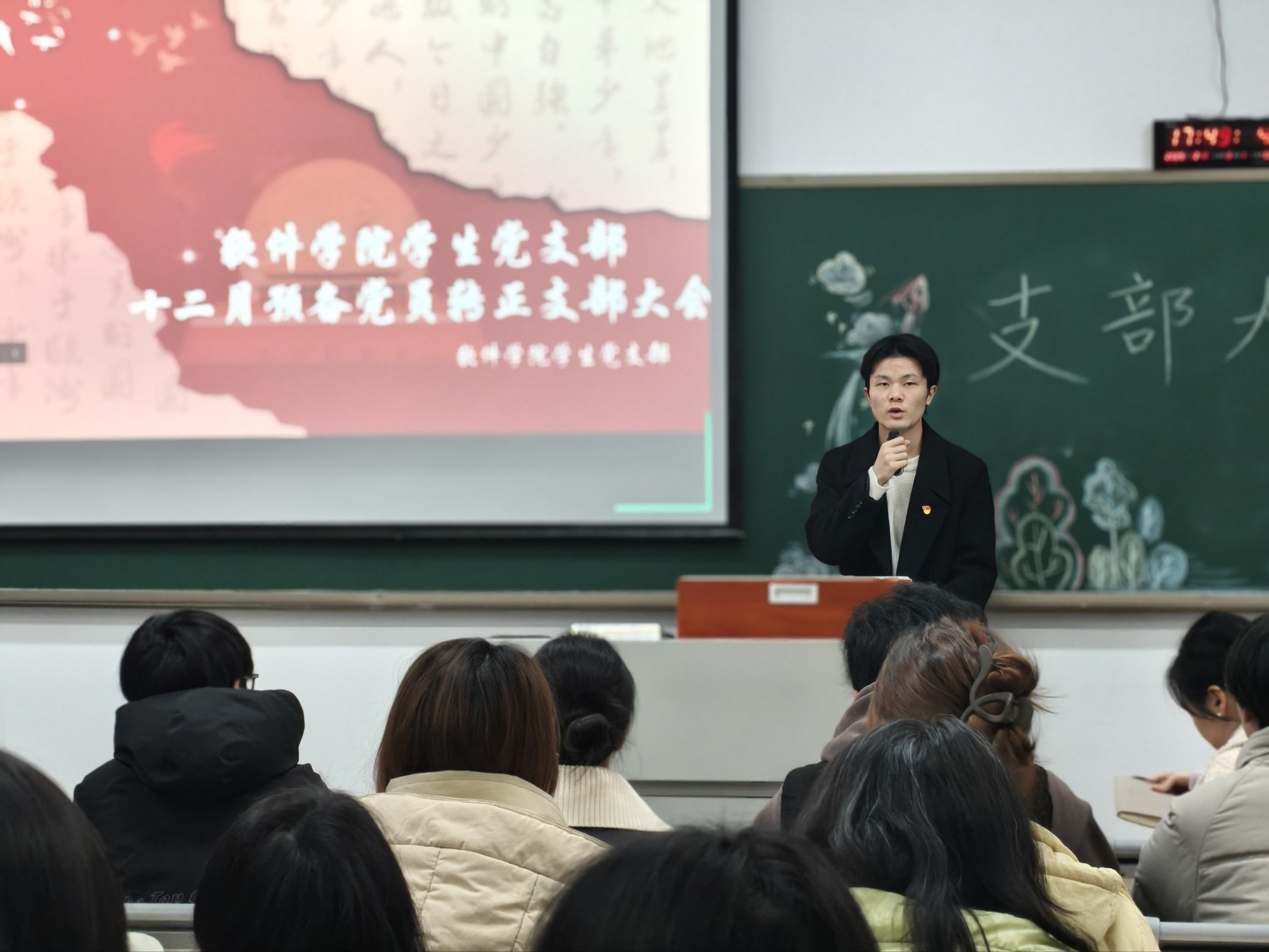 为检验学生党员初心成色、夯实支部建设根基,12月24日下午17:30,软件学院学生党支部于1619教室召开十二月支部大会。会议由李林杰同志主持,学生党支部书记邵亚茹老师,支部全体党员、入党介绍人、党小组成员及群众代表共同参会。