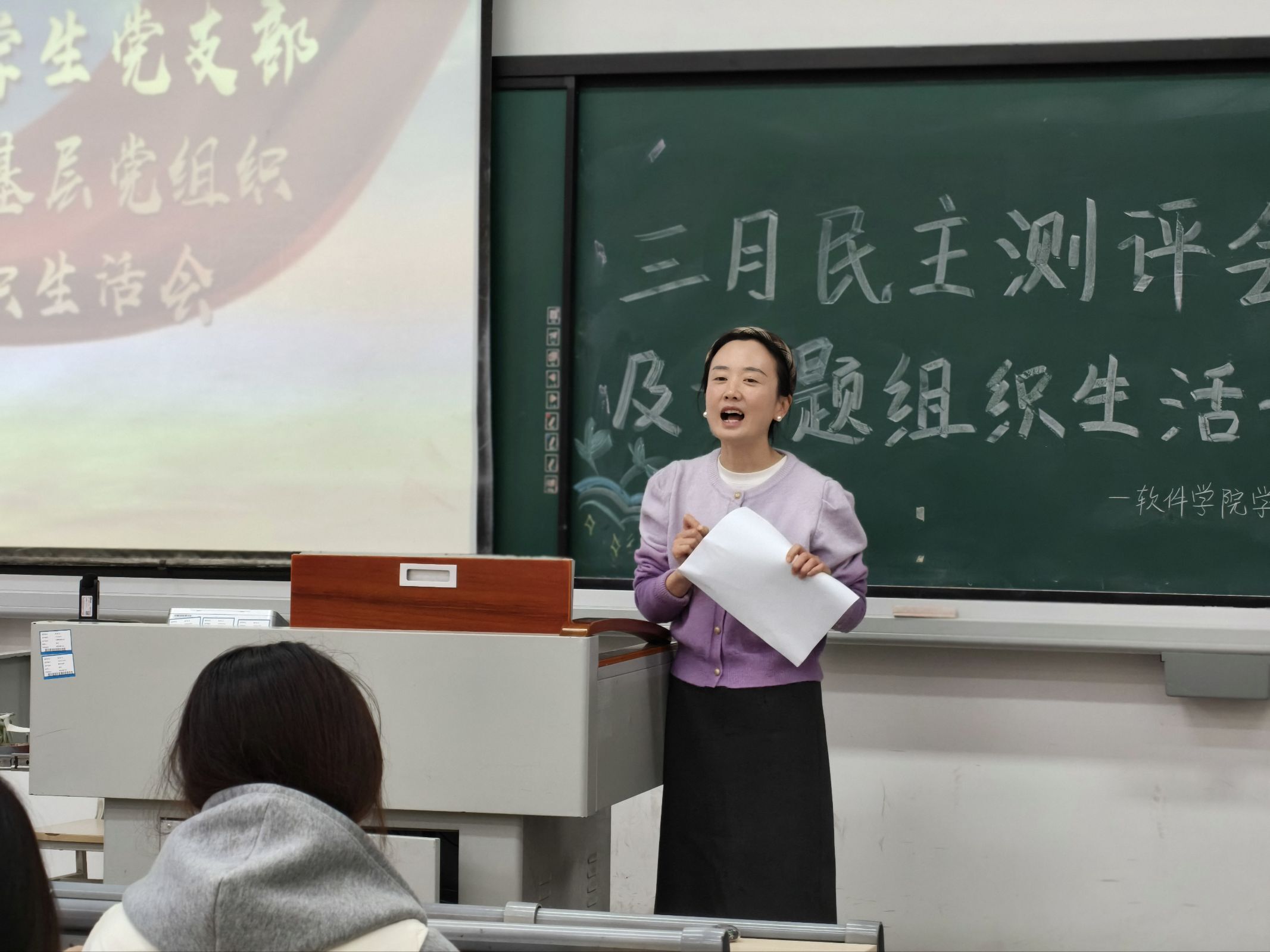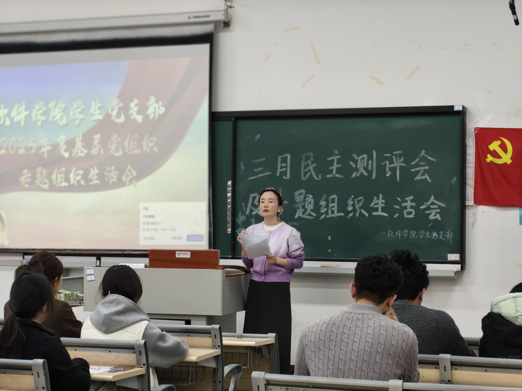 为深入学习贯彻党的二十大和二十届四中全会精神,持续强化作风建设,3月11日中午12:30,软件学院学生党支部在1306教室组织开展2025年度专题组织生活会暨民主评议会。会议由学生党支部书记邵亚茹老师主持,我院党总支副书记刘有沛、专职辅导员及全体学生党员参会。